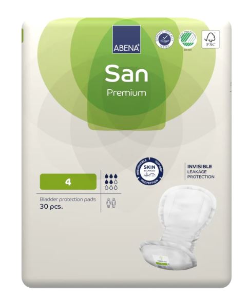Abena San é a gama completa de pensos para incontinência de forma anatómica da marca Abena, projetada para todos os graus de incontinência variando desde a leve até à muito severa.