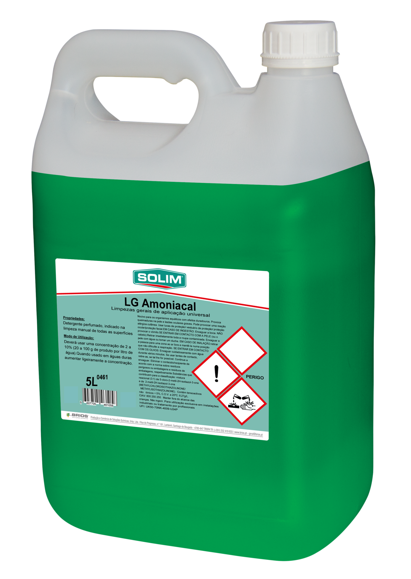 Galão plástico verde com pega branca e etiqueta branca LG Amoniacal SOLIM 5L
