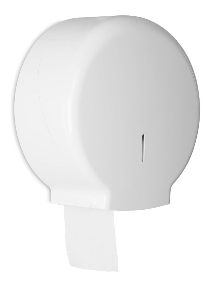 Suporte jumbo industrial de alta capacidade, ideal para ambientes com grande fluxo de utilização, como empresas, hotelaria, hospitais e indústrias. Fabricado em plástico ABS resistente ou aço inox, garante durabilidade, higiene e facilidade de manutenção. Compatível com rolos jumbo standard e permite um consumo eficiente de papel.